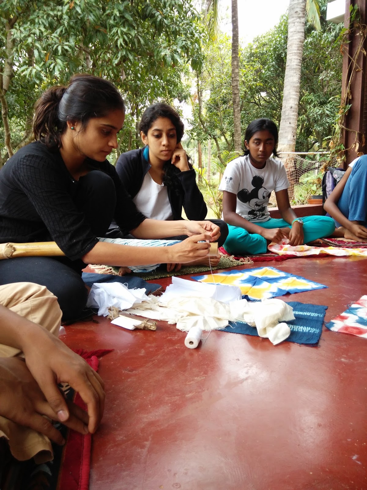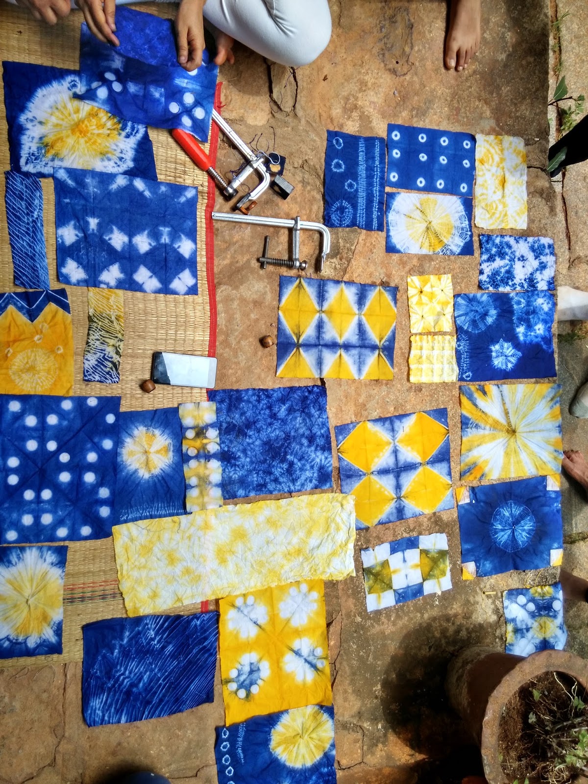 We had a one day intense workshop with Nikita Jain and Priyanka Patel , where they shared with us the magic of Shibori. We had done tie-dye earlier, and were fascinated by the simple technique of knotting and dyeing fabric to create happiness!